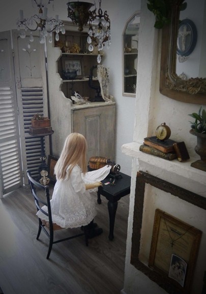 今までには無かったような人形作品集にしたいと思ってデザインを考えました。 その一つが背景となる庭や部屋もこだわってつくったことです。 人形のための部屋をセルフリフォームする一方で、ありそうでなかった、部屋やキャビネットに人形を飾っている写真も撮りました。 中には、ぬいぐるみさんと遊びだしてしまった子もいますが(笑) アンティークの人形サイズの家具との可愛い写真もあれば、 ダークカラーのシックな写真も。 人形がつぶやいているページ。写真をコラージュしているページ。 制作途中のお顔やボディもちょっぴり載せました。 少しでも楽しんで頂けるものにしたいとの思いで本の全てに全身全霊を込めました。 「あれっ、こんなところにも男の子が。」と思うようなところにも写真があるので、 見つけてあげてくださいね。